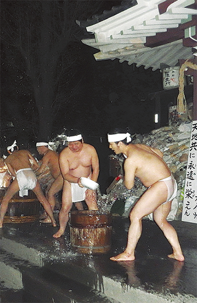 中村宮司と知人ら7人が「禊神歌」を唱えた後、直径1mの桶から水を勢いよくすくいあげてかぶった。