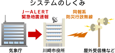 今回の放送はJ―ALERT(ジェイアラート)(全国瞬時警報システム)と連動したもので、気象庁が発表する川崎市を対象とした緊急地震速報が自動で放送されるしくみ。