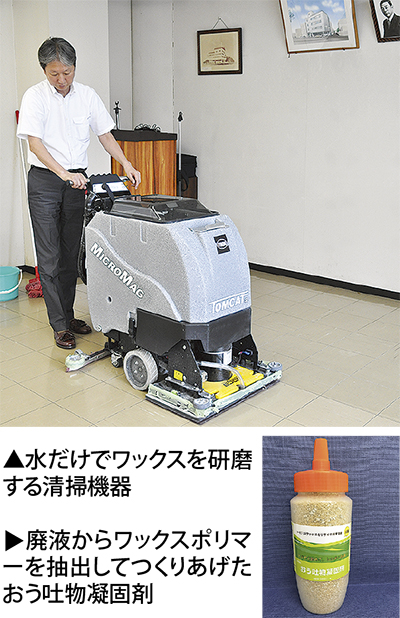 こうした中、同社は剥離剤を使わず、水だけでワックスを研磨、さらに発生した廃液の中からワックスポリマーを抽出し、おう吐物凝固剤や防虫剤・消臭剤にリサイクルする「ワクスル グリーンクリーニング」を開発した。名称のワクスルには「ワックスとワクワクするの意味を掛け合わせている」と、中西正敏取締役は説明する。