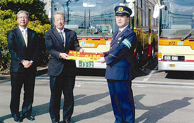 相模原警察署(長谷川茂署長)、相模原交通安全協会(井上政市会長)などは11日、市内下溝にある神奈川中央交通(株)神奈川営業所で、自転車マナー向上運動ステッカーの贈呈および出発式を行った。