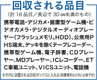 今回の事業は2016年3月31日まで実施される。約3年間で回収量、費用、品目、回収ボックスの場所など、必要となるデータを採集し、今後に活用したい意向だ。回収場所は現在検討中で、公共施設など市内15から20カ所になる予定。核施設に設置される専用ボックスに家電を入れる形式で、携帯電話、デジタルカメラなど国が推奨する16品目が対象となる(表参照)。大型家電と違い費用はかからない。県内では伊勢原市が5品目を対象に同様の事業を始めている。市廃棄物政策課では、色々な媒体で周知を図るとしており「ごみの減量、資源化につながれば」と話している。