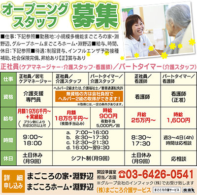 認知症の認定を受けている高齢者が家庭の雰囲気の中、専門の介護スタッフと一緒に共同生活を送りながら自立した日々を過ごすグループホーム。同社では少人数(9人まで)をグループに、一人ひとりのライフスタイルを尊重したケアを提供しながら、心身や行動の安定を目指していく。一方、小規模多機能は、介護が必要な状態になっても、住み慣れた地域で生活したいという人向けのサービス。「通い」「訪問」「宿泊」を本人や家族の状態や環境で、組み合わせて提供していく。「365日、24時間の安心をお届けします」と同社。詳しくは入居説明会で。説明会日程=3月16日(土)17時半/20日(水)9時/22日(金)17時半/26日(火)13時/28日(木)17時半/30日(土)13時