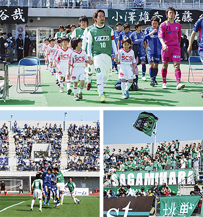 待ちわびた約5000人ものサポーターたちが詰めかけたダービー当日。競技場は緑と青のコントラストに彩られた。相模原の選手たちに硬さが色濃く残る中、ゲームが始まると前半15分に町田が先制。37分に新加入の御給(ごきゅう)匠のゴールで追いつくがその後も得点を許した。前節同様、試合終了間際にも失点した相模原。JFL昇格後、初のホームゲームを勝利で飾ることはできなかった。