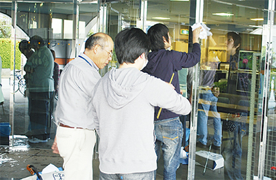 13人の参加者は、さがみビルメンテナンス協同組合の鈴木正博さんの指導のもと、用具の正しい使い方やガラスの磨き方などを実習。キレイになっていくガラスを前に、感嘆の声を漏らす場面もあった。西門商店街では今後も生活保護受給者を支援していきたい考え。