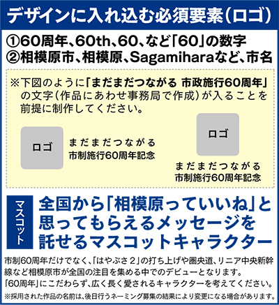 来年、市制60周年を迎える相模原市はその記念事業として、ロゴマーク、市公認の公式マスコットキャラクターのデザインの募集を1日から開始した。市がロゴマークを募集するのは50周年以来2度目で、マスコット制作に乗り出すのは今回が初めて。市民はもとより、全国的に広く親しまれる作品を求めている。