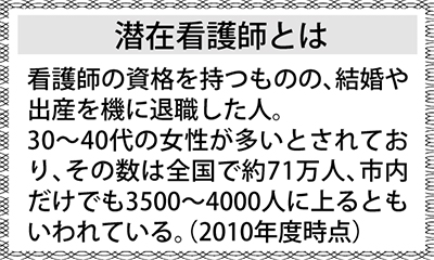「潜在看護師」とは、看護師資格を持つものの、結婚や出産、子育てを理由に現場を離れ、その後未就労の人をさす。その数は全国で約71万人いるとされており(2010年度時点)、市内だけでも3500〜4000人に上るといわれている。少子高齢化の進展や医療の高度化に伴い、看護師不足が叫ばれている近年では、潜在看護師の復職が要員不足解消のカギになるとされている。