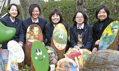 市役所そばのこけ丸の森で3月23日、弥栄高校美術部の学生が丸太の表面にデザインした作品が飾られ、アートで彩られた。