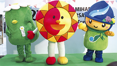 同店では25日、相模原市の「さがみん」、相模女子大学の「さがっぱ・ジョー」、同店25周年記念キャラクター「ピカタン」の3体が揃って登場した。