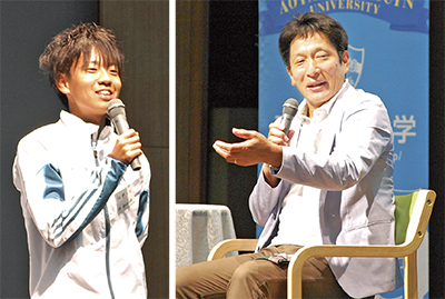 前半のトークショーは、原監督が、登場するやいなや会場に詰め掛けた観客に「僕を観に来たんじゃないでしょ。神野でしょ」と冗談を飛ばし、笑いを誘うなど、終始和やかな雰囲気で展開。同部の近況をはじめ、総合優勝した今年の箱根駅伝を含めた監督就任以来の歴史を振り返った。あわせて、昨年から同部のフィジカルトレーナーを務める中野ジェームズ修一さんを交え、同部が力を入れている筋力トレーニングの方法などについて語られた。