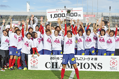 菅野将晃監督は「皆さん、お待たせしました。やったぞー!」と絶叫。「現在の20人のメンバーだけでなく、チームを支えてくれた13人のOGにも拍手をおくって頂きたい。これからも皆さんと共に地域に愛されるチームとして、サッカーを盛り上げていきます。来年から5シーズンかけて、なでしこリーグ1部優勝を次の目標にしていきますので、一緒に戦いましょう」と呼びかけた。