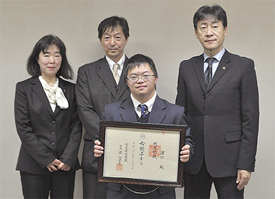 ダウン症による心身の発達障害を持つ、県立相模原中央支援学校高等部知的障害教育部門2年の浜口純(まこと)さん(17)が、昨年11月に開催された「相模原地区剣道段位審査会」で初段審査に合格した。浜口さんは両親らとともに2月23日、野村謙一教育長を訪問し喜びを報告。ダウン症の人の審査合格は、市剣道連盟で初めて。