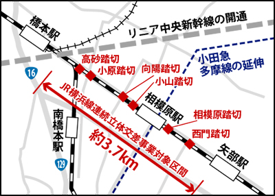 立体交差化が検討されているのは矢部駅から橋本駅付近までの約3・7Kmの区間。相模原駅と橋本駅周辺を一体的に整備する「広域交流拠点」の整備計画の中では、周辺道路の渋滞緩和や南北一体の市街地形成に向けて取り組むべき課題の一つに挙げられている。