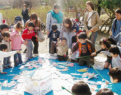 「歩ける子なら、竿(さお)を渡すよ」と野口さん。おおよその時間は、午前8時から午後4時まで。お手製の海洋生物たちは紙でできているため、水がNG。開催の可否は天候に左右される。参加は無料。希望者には”ニモ”(カクレクマノミ)のお面がお土産に渡される。問同公園管理事務所【電話】042・777・3451