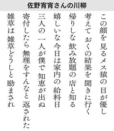「万能川柳(毎日新聞に掲載の投稿コーナー)の”山頭火(さんとうか)”。こんなにすごい人が昔いたということを知ってもらいたい」と水野さん。佐野さん(福岡県出身)は万能川柳界で伝説の作家(・・・・・)と言われた存在。今回は佐野さんが残した約250点を1冊にまとめあげた。「お亡くなりになって10年、良いご供養をさせていただけたのではないかと思っています」。定価800円。A6判114頁。