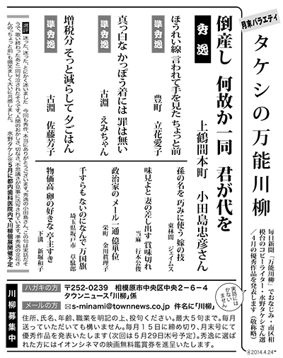 タウンニュースさがみはら南区編集室では毎月月末週の発行号に掲載している「タケシの万能川柳」コーナーへの川柳を募集しています。