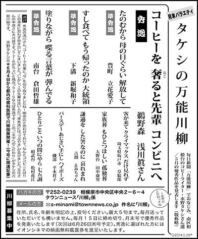 タウンニュースさがみはら南区編集室では毎月月末号に掲載される「タケシの万能川柳」コーナーの川柳を募集しています。応募いただいた川柳は毎日新聞「仲畑流万能川柳」などでおなじみの水野タケシさん(南台在住)が選句します。応募方法は左記枠内にて。