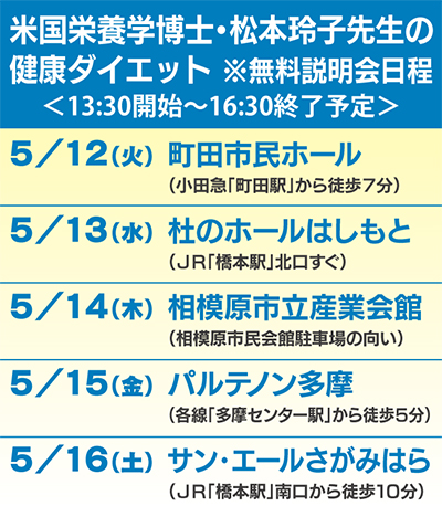 全国各地で50〜70代の女性から評判を呼んでいる「米国栄養学博士・松本玲子先生の健康ダイエット」。