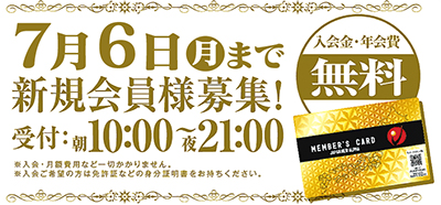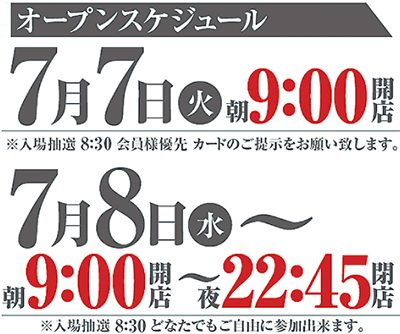 グランドオープンは7月7日の午前9時。8時30分から入場抽選会を行う。この抽選会への参加は会員が優先。同店では6日(月)まで新規会員を募集している(受付午前10時〜午後9時)。入会金・年会費は無料。詳しくは下記へ。