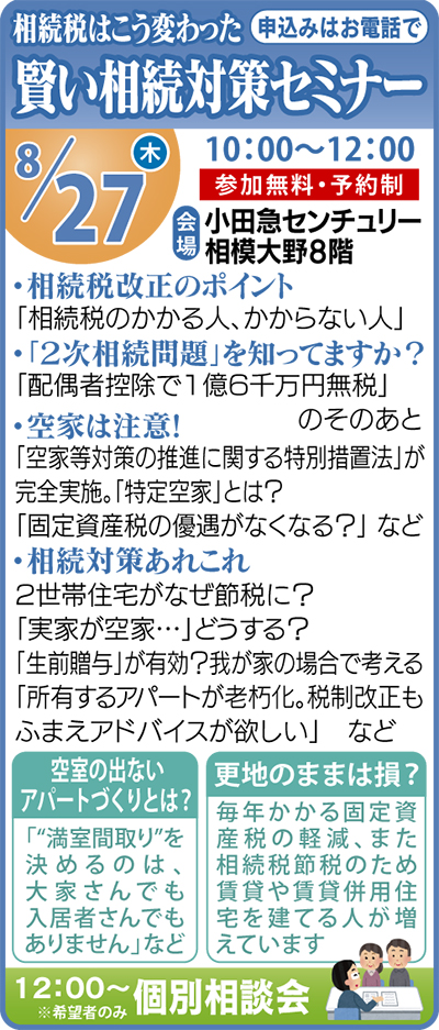 セミナーでは相続増税のポイントなどをやさしく解説するほか「子が独立して夫婦2人には広すぎる自宅」など身近な実例を取り上げ、対策方法を多数紹介する。「分かりやすい」と好評なので、ぜひ参加を。