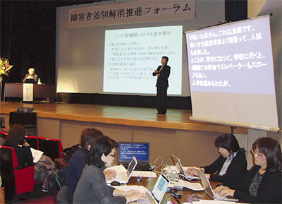 こうした障害をめぐる市内でのトラブルをなくすため、障害者が生活する上で身近にある飲食店やサービスなどを運営する事業者に対して同法の理解を深めてもらおうと、同法人では、市からの委託を受けて1月に「障害者差別解消推進フォーラム」を開催。毎日新聞社論説委員による講演と市内の関連団体によるパネルディスカッションを行った。あわせて2月中には、同法の概要のほか、個々の障害の特性に合わせた対応の仕方などを掲載したホームページも開設する。「普段の生活の中で障害者に接する機会がほとんどない方にぜひ見ていただきたい。まずは障害について知ってもらうことで、差別の解消につながれば」と鈴木会長は話している。