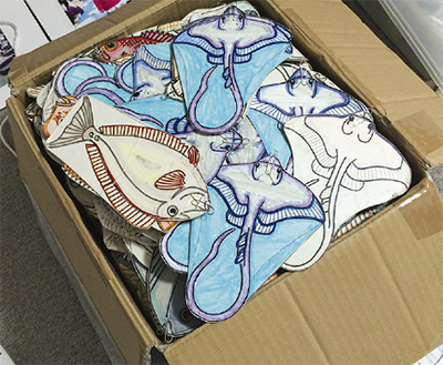 水を模したブルーシートに並べられたクリップ付のアジやイカ、毛ガニ、クラゲなどを、磁石のついた糸で釣り上げる。原則的に晴れた日曜日と祝日に実施。30回を超える頃から順番待ちの子どもたちが列を作るほどになり、今年3月には220回を超えた。「笑顔を見られるのが何より嬉しい」と話す野口さん。毎回釣りぼり遊びが終わると1匹1匹にブラシをかけ、傷んだ部分を修復する。毎日コツコツと作りためた魚たちは今では1300匹となった。最初は景品として配っていたお面も人気となり、「毎日作り続けないと足りなくて」と苦笑する。