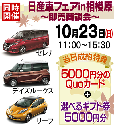 「地域感謝デー」「日産車フェア」とも問い合わせは左記の連絡先へ。