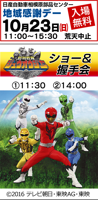 今年のキャラクターショーには「動物戦隊ジュウオウジャー」が登場。ショーは午前11時30分からと午後2時からの2回。いずれも握手会も実施。その他、大道芸のパフォーマンスも登場する。