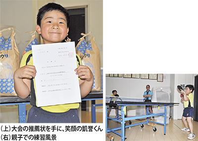 凱誉くんは2歳年上の兄・壱弦(いづる)くんと共に、父・雅浩さんのもとで4歳から卓球を始めた。平日は早朝と放課後に2時間ずつ、土日は一日5時間、兄弟で365日練習に励んでいる。高校生や大学生の練習に参加しても、そん色ない腕前だという。市内の内出中(緑区下九沢)で外部指導も行う雅浩さんは「気持ちで負けないことを重視している。技術面はもちろん、精神面も強くないと大会で力を発揮できない」と話す。