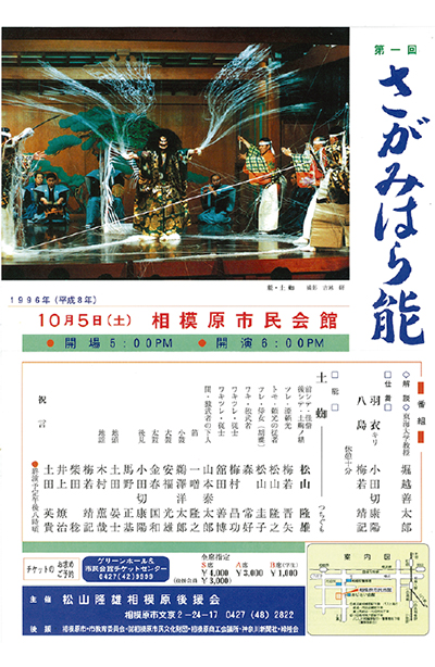 第一回さがみはら能が開催されたのは1996年10月。友人の紹介で加入した相模原南ライオンズクラブ内で後援会が発足し、市や文化財団等の後援を得て市民会館で開かれた。チラシの題字は当時の市長、故・舘盛清光氏が手掛けたもので、現在も使用されている。松山さんは幸子さん、息子の隆之さん、梅若一門と共に能「土蜘(つちぐも)」を演じた。翌年からは会場をグリーンホールに移し、回を重ねながら、自作の能の上演や二胡奏者を招くなど工夫を凝らしてきた。何より大事にしてきたのは「続けること」。時には自ら資金を補てんしてでも、相模原の地で能を普及させることを念頭に活動してきた。