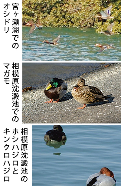 相模原区域の調査所では、宮ヶ瀬湖[清川村含む]が892羽(429羽)、相模川〔調査地点9カ所〕が488羽(757羽)、相模湖が380羽(350羽)、津久井湖が316羽(410羽)、相模原沈殿池が307羽(256羽)と多く、管内全体でも上位を占めている。