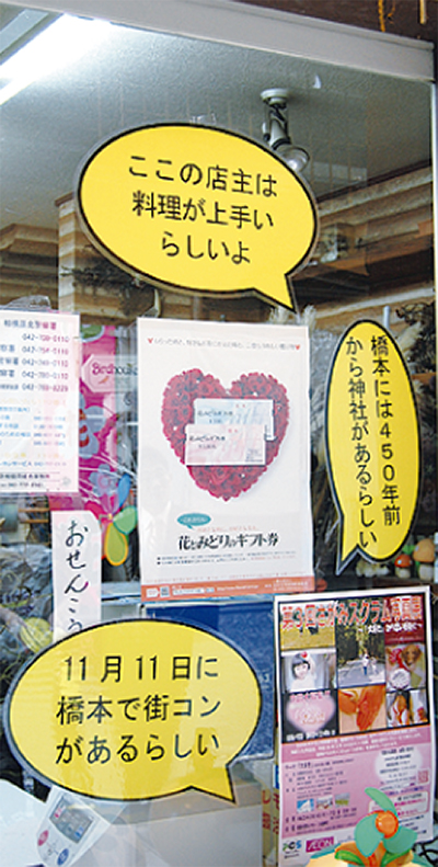 橋本商店街協同組合(古橋裕一理事長)は11月1日から、「うわさプロジェクト」と題したユニークな活性化事業を開始した。店舗内や店舗入り口にその店や街のうわさをポップで掲示し、顧客や街を行き交う人とのコミュニケーションの活性化を図ることで、商店街や街を盛り上げていきたい意向だ。