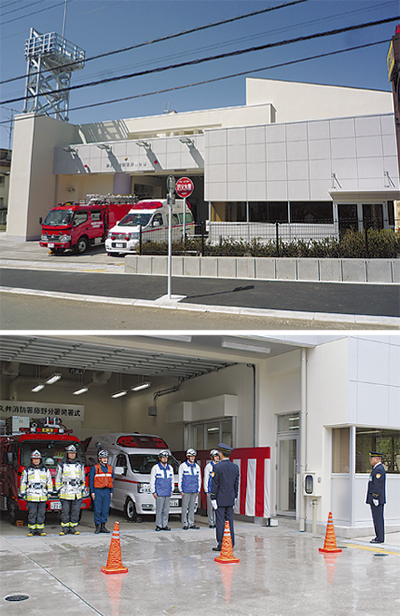 これまで日連にあった同庁舎が新たに移転したのは、約2Km離れたシュタイナー学園高等部の隣(吉野433の1)。延床面積は630・44平方メートルと旧庁舎の3・5倍ほど広くなり、消防ポンプ車1台、高規格救急車1台、広報車2台、情報収集用バイク1台が配置されている。