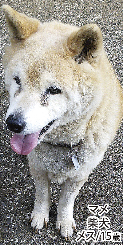 犬はメスの15歳で、名前は「マメ」。毛は薄い茶色で四肢は白い。柴犬の中でも「豆柴」と呼ばれる種類で、体躯は6kg程度と小柄。