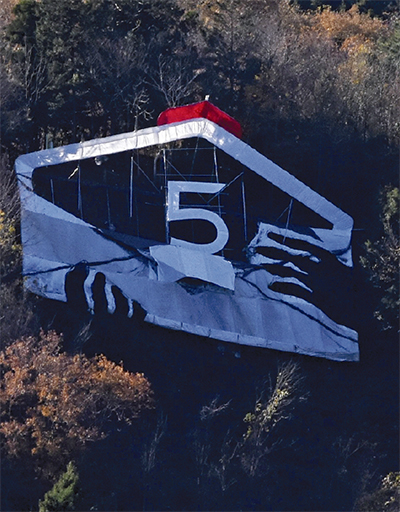 藤野地区にある野外巨大アート作品「緑のラブレター」。芸術が盛んな同地区のシンボルとなっているこの作品は現在、ハートによってとじられていた封が解かれ、中から「5」の文字が登場している。これは緑区制5周年を記念し、2016年3月までの期間限定で開封されたもの。同作品の封が開けられたのは1989年の完成以来、初めて。