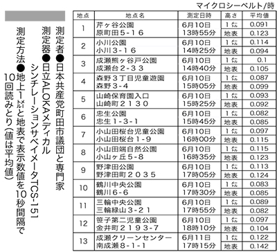 市民から町田市内の放射線量を知りたいという声が多い中、日本共産党町田市議団(殿村健一代表)は6月10、11日、専門家と共に市内13ヵ所で放射線量を測定した。