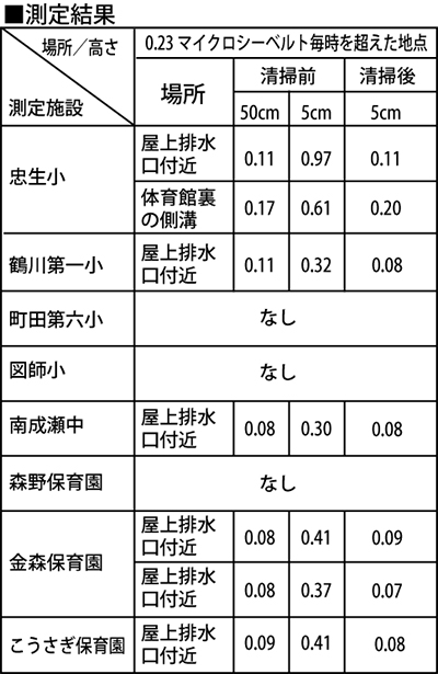 測定した8施設は公立の小中学校と保育園。一番線量が高かったのは忠生小で、校舎屋上の排水口の吸水側付近で毎時0・97マイクロシーベルト、また体育館裏の側溝では5cmのところで毎時0・61マイクロシーベルトを記録した。除染作業後は屋上では毎時0・11マイクロシーベルト、側溝では毎時0・20マイクロシーベルトとなった。