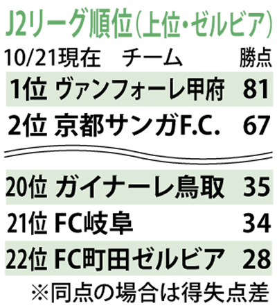 21日の愛媛FC戦、2―4で敗れ、J2残留に黄色信号が灯った。現在J2最下位のゼルビアは勝点28、21位のFC岐阜は6差の34。残すはあと3試合。28日のホーム戦はそのFC岐阜と対戦(午後1時キックオフ)。ここで負ければ勝点が6差以上となり、残り2試合のためJFL降格が決定する。