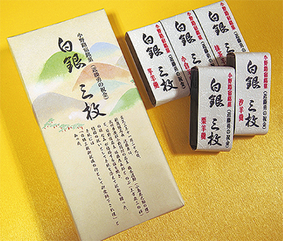 「白銀三枚」は地元和菓子店『蛸八』(本町田3592の5)が製造し、同店のほか、町田ツーリストギャラリー、薬師公園内やくし茶屋、小島資料館で販売されている。