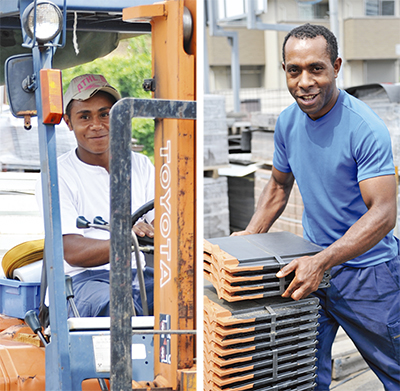 町田市真光寺町の(株)鈴木瓦店で、パプアニューギニアから来たアパ・コアさん(26)とアガスティン・モンゴル・アバさん(22)が建築の技術を身に付けるため研修を受けている。