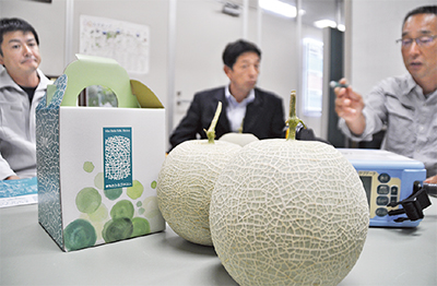 「おかげさまで予約が多く、やや品薄になっています」と嬉しい悲鳴を上げる同農園の松浦真さん。「非破壊糖度計で独自規格を設定。食味や熟成度など慎重に吟味して販売しています」と話す。
