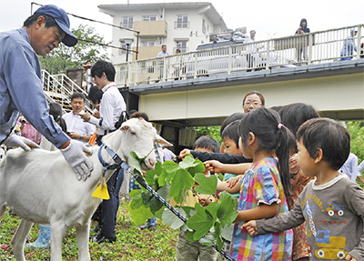 14日には同団地自治会が中心となり「歓迎会」を開催、団地の住民や地域の幼稚園や保育園の園児らが2匹のヤギを歓迎した。園児らはヤギや動物が出てくる童謡を披露し、エサを与えたり、体をなでたりして、ヤギとの触れ合いを楽しんだ。