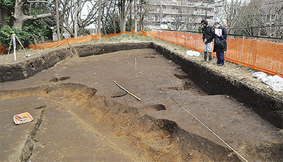 2月6日に開始された今回の調査では、鶴間公園の丸山峠と呼ばれる雑木林の高台約375平方メートルを2回に分けて試掘した。50cmほど掘り下げたところで、土器の欠片が出土し、竪穴式住居跡と思われる約4m四方の遺構が発掘された。板垣さんは「はっきりと柱の跡や竈(かまど)の跡がうかがえます。人工だと思われる溝も発掘された。水が流れていた形跡がないので何かしらの区画としての溝と考えられます」と説明。