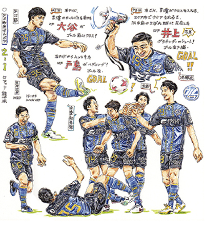 絵描き、ながさわたかひろ(=人物風土記で紹介)は、気持ちを伝えたい対象を絵や版画で描き、作品を見てもらう活動をしている。今年のテーマはサッカーで、現在はゼルビアの試合を描く日々を送る。ゼルビアの選手たちとの作品を介したつながりを力に躍動感を増す、新作の数々を見ることができる。開催期間中も試合に合わせて、随時作品が追加される。
