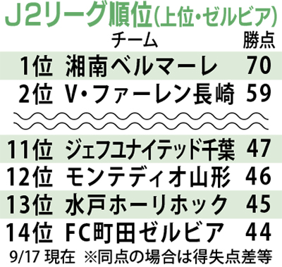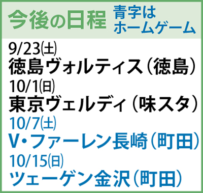 次節は9月23日(土)、アウェーで徳島ヴァルティスと対戦(徳島・午後4時キックオフ)。次のホーム戦は10月1日(日)、東京ヴェルディを迎え撃つ(午後3時キックオフ)。ホーム戦のチケットは市内の郵便局で購入することができる。