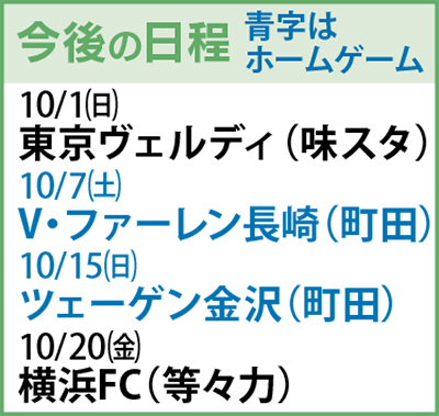 次節は10月1日(日)、味の素スタジアムで東京ヴェルディと対戦する(午後3時キックオフ)。次のホーム戦は10月7日(土)、V・ファーレン長崎を迎え撃つ(午後4時キックオフ)。ホーム戦のチケットは市内の郵便局で購入できる。