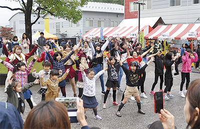 今年は初めて石川県の能登キリコが登場。高さ10mを超す巨大な灯篭が会場を練り歩いた。また祭り最中に、観覧や模擬店で買い物などをしていた子どもたちが突然踊りだし、来場者の度肝を抜いた。これは恒例となったフラッシュモブの一幕=左写真。会場全体がひとつになり、祭りを楽しんでいた。