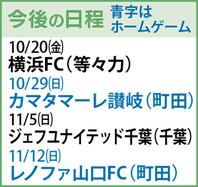 次節は10月20日(金)、等々力陸上競技場で8位の横浜FCと対戦する(午後6時30分キックオフ)。次のホームゲーム(町田市立陸上競技場)は10月29日(日)、カマタマーレ讃岐を迎え撃つ(午後3時キックオフ)。ホーム戦のチケットは市内の郵便局で購入できる。