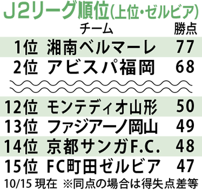 リーグ戦は残り5試合(ホームゲームは2試合)。ゼルビアは15位で10位の千葉まで勝点差6だ。