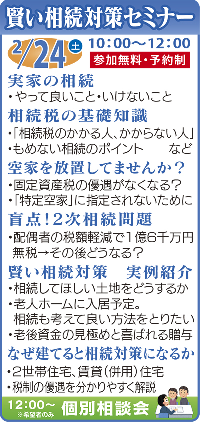 セミナーでは相続の基礎を解説するほか「子どもが独立して夫婦2人では広すぎる自宅」「財産のほとんどが不動産。どう分ける?」など、身近な実例を取り上げ対策を多数紹介。さらに老後資金の確保をした上での喜ばれる相続対策(生前贈与など)や賃貸(併用)住宅等を建てると相続税や固定資産税が大幅に軽減される仕組みも説明。ぜひ参加を。※当日参加できない人にはセミナー資料を後日進呈(電話で申込みを)。