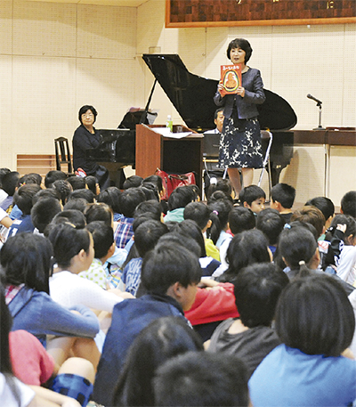 高橋さんは講演で、絵本や音楽も使う。音楽のパートナーは坂内英子さん。在校生たちには「いのち」について、優しい言葉で話しかけ始める。「へその緒」の模型を使っておなかの中にいた時のこと、ちょっと成長して友だちのこと、そして学校のこと、自分のこと…。高橋さんが絵本を読み聞かせ、坂内さんがピアノを奏でる。子どもたちはスーと、言葉と音楽の世界へと入っていく。